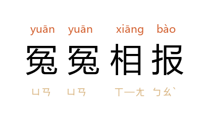 引元·无名氏《货郎旦·第四折》:「又谁知苍天有眼,偏争他来早来迟,到今日冤冤相报,解愁眉顿作欢眉。」《红楼梦·第五回》:「冤冤相报实非轻,分离聚合皆前定。」