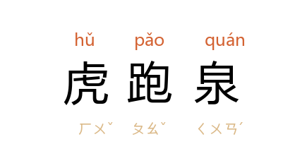 ⒈ 泉名。在浙江省杭州市西湖西南虎跑山原虎跑寺中。泉水自山岩中间流出,甘冽醇厚,为全国名泉之一。虎跑寺原名大慈寺,始建于唐,以后历经修建,为西湖名胜。