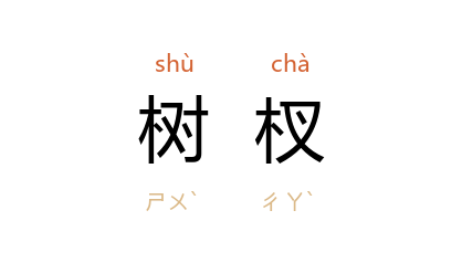 引田汉 《洪水》第二场:“谁想到我们今年要在屋顶上、树杈上和土堆上过中秋哩。”《中国民间故事选·荨麻与艾蒿》:“她赶紧跑进房子后面的果树园子,跐蹓跐蹓很快地爬上了结满甜桃的树杈把上。”