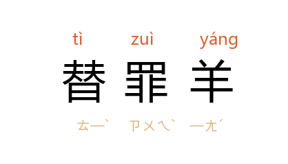 ⒈ 古代犹太教祭礼中替人承担罪过的羊。据《圣经·利未记》载:古代犹太教每年一次由大祭司按手在羊头上,表示全民族的罪过已由这头羊承担,然后把羊赶入旷野。后以“替罪羊”比喻代人受过的人。