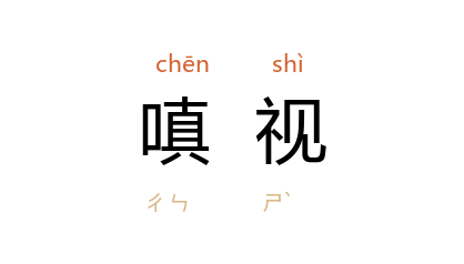 引唐 孟郊 韩愈 《城南联句》:“妖残梟鵅惸,窟穷尚嗔视。”茅盾 《昙》四:“女人嗔视着有两三秒钟之久,然后粗暴地抓着男子的臂膊,走向树径中去了。”冰心 《观舞记》:“忽而张目嗔视,表现出叱咤风云的盛怒。”