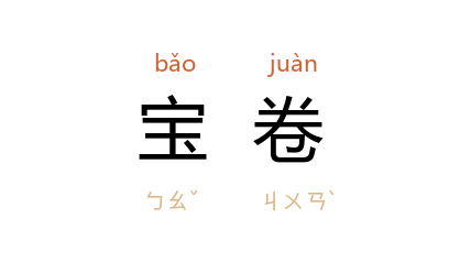 ⒈ 一种讲唱文学形式,由 唐 代的变文和 宋 代和尚的说经发展而成。早期作品的题材多为佛教故事,宣扬因果报应,以用七字句、十字句的韵文为主,间以散文。现存《香山宝卷》,一般认为是 宋 代 普明 和尚的作品。 明 代以后,取材一般民间故事和现实生活的宝卷日益流行,有二百种以上,例如《梁山泊宝卷》、《土地宝卷》、《药名宝卷》等。佛家宣讲宝卷称“宣卷”,后来发展成为一种曲艺。