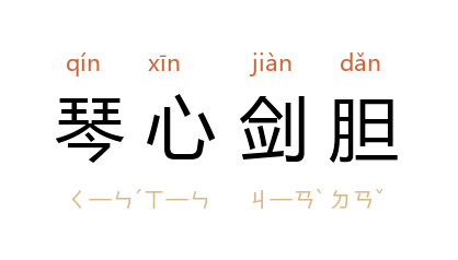 引元 吴莱 《寄董与几》诗:“小榻琴心展,长缨剑胆舒。”清 古越嬴宗季女 《六月霜》第三出:“你如莫邪刚,并剪快,哀梨脆,琴心剑胆羞姿媚。”