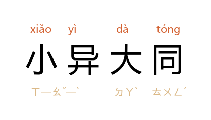 引南朝 梁 刘勰 《文心雕龙·檄移》:“意用小异而体义大同,与檄参伍,故不重论也。”鲁迅 《中国小说史略》第二八篇:“官场伎俩,本小异大同,滙为长编,即千篇一律。”鲁迅 《华盖集·通讯》:“在现在,我倒只希望这类的小刊物增加,只要所向的目标小异大同,将来就自然而然的成了联合战线。”