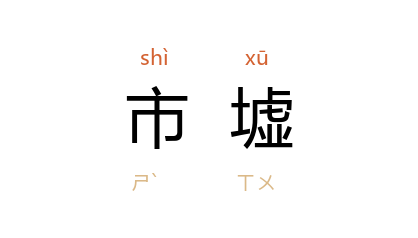 引宋 陆游 《题野人壁》诗:“市墟买酒何人识,僧阁煎茶欠客同。”清 褚人穫 《坚瓠十集·枣谣》:“买枣数十觔,每至市墟,呼羣儿至,每儿与枣一掬。教之曰……一路童謡载道。闻者争觅其旅邸访之,大获贐利。”