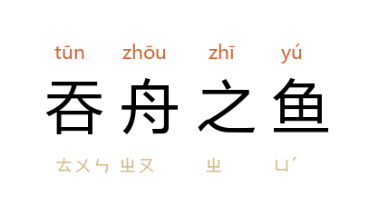 引《庄子·庚桑楚〉:「吞舟之鱼,砀而失水,则蚁能苦之。」后比喻犯大罪的人。《史记·卷一二二·酷吏传·序》:「汉兴,破觚而为圜,斲雕而为朴,网漏于吞舟之鱼,而吏治烝烝,不至于奸,黎民艾安。」