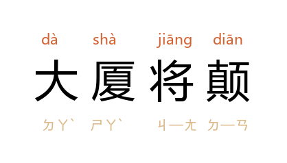 引隋 王通 《中说·事君》:“﹝ 文中子 ﹞退而谓 董常 曰:‘大厦将颠,非一木所支也。’”亦作“大厦将倾”。 丁玲 《太阳照在桑干河上》三七:“从去年她娘家被清算起,她就感到风暴要来,就感到大厦将倾的危机。”