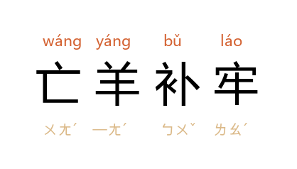 ⒈ 语出《战国策·楚策四》:“亡羊而补牢,未为迟也。”丢失了羊,赶快修好羊圈。比喻失误后及时补救。