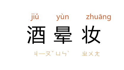 引唐 宇文士及 《妆台记》:“美人妆面,既傅粉,復以胭脂调匀掌中,施之两颊,浓者为‘酒晕妆’,浅者为‘桃花妆’。”