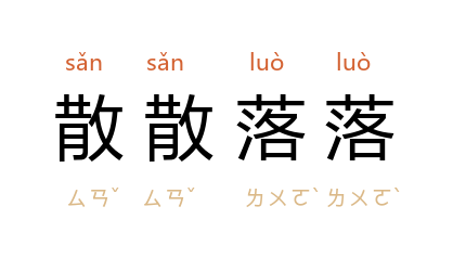 引茅盾 《锻炼》八:“大厅内散散落落坐着四五个长袍短褂的人。”林海音 《城南旧事。我们看海去》:“他说夹竹桃叶子太多了,花就开得少,去掉一些叶子,又用细绳儿把枝子捆扎一下,那几棵夹竹桃,就不那么散散落落的了。”