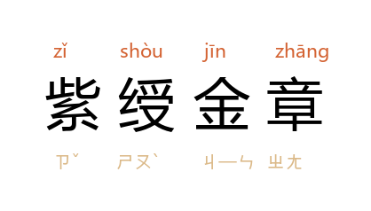 ⒈ 绶,系在印纽上的丝质带子。紫绶金章指身上佩带系著紫色丝带的金印,即比喻高官厚禄。