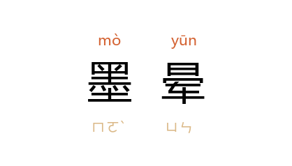 ⒈ 写书法时墨渗出笔画之外,形成较淡的墨迹,称为「墨晕」。通常墨磨得不够浓或写在未曾砑过的生纸上,都会发生这种现象。