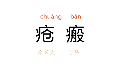 引《后汉书·马廖传》:“吴王 好剑客,百姓多疮瘢。”《法苑珠林》卷四八引《菩萨本行经》:“作是语已,身即平復,无有疮瘢。”清 黄景仁 《黄山寻益然和尚塔不得》诗:“疮瘢洗涧瀑,剑术教猨猱。”