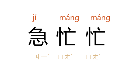 引《水浒传》第一〇三回:“﹝ 王庆 ﹞急忙忙的奔走,到红日东升,约行了六七十里。”《西游补》第六回:“那些侍女们含着泪珠,急忙忙跟了 项王,走到阁上。”《二十年目睹之怪现状》第一〇七回:“那老妈子连爬带跌的跑了出去,急忙忙登岸。”