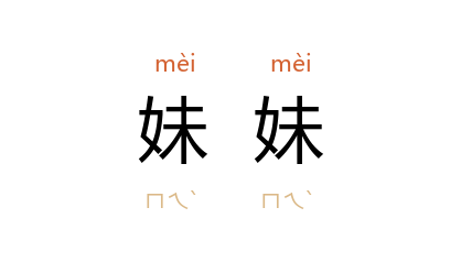 ⒈ 称谓:(1) 同父母所生而比自己年幼的女性。也称为「妹子」。(2) 同辈中比自己年幼的女性。(3) 对妻子的暱称。