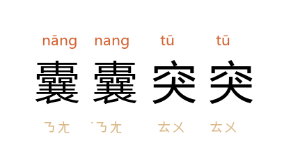 引元 郑廷玉 《楚昭公》第三折:“俺只见掩掩泼泼画船儿歪,囊囊突突梢公絮。”《西游记》第七五回:“唬得个獃子在草里囊囊咄咄的埋怨。”