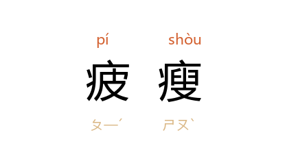 引《北齐书·陈元康传》:“从 高祖 破 周文帝 於 邙山,大会诸将议进退之策,咸以为野无青草,人马疲瘦,不可远追。”南朝 梁 陶弘景 《冥通记》卷二:“去岁十月至其今年三月,恒菜食,既辛苦疲瘦,姨母更劝令渐进,裁少少而已。”清 黄六鸿 《福惠全书·莅任·清查之法》:“如疲瘦老残、不堪应差者,退令买补,不得草率交收,自貽赔累。”