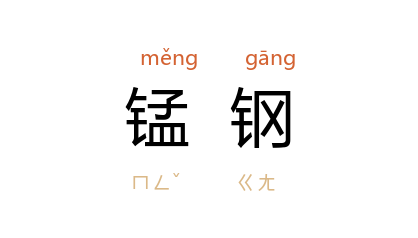 ⒈ 一种韧度与耐磨度很高的合金钢。成分中含锰量大于千分之八,多用来打制耐磨的零件和工具。
