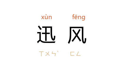 引《楚辞·远游》:“軼迅风於清源兮,从 顓頊 乎增冰。”汉 王粲 《七哀诗》:“迅风拂裳袂,白露霑衣衿。”清 张云璈 《杨酆都殉难》诗:“狂蛟退入 冯夷 宫,贼如落叶随迅风。”