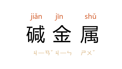 ⒈ 锂、钠、钾、铷、铯、钫六种金属元素的统称。碱金属的氢氧化物是最强的碱性化合物。