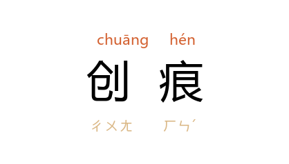 引《三国志·吴志·周泰传》:“权 自行酒到 泰 前,命 泰 解衣, 权 手自指其创痕,问以所起。”冰心 《南归》:“现在我不妨解开血肉模糊的结束,重理我心上的创痕。”茅盾 《子夜》十七:“现在离开了斗争中心已远,忽然睁眼见了那平静的田野,苍茫的夜色,轻抚着心头的生活斗争的创痕,也不免感喟万端。”