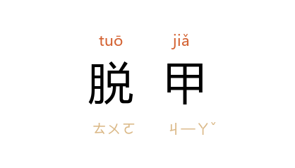 引《三国志·魏志·陈思王植传》:“使边境未得脱甲,谋士未得高枕。”宋 苏辙 《龙川别志》卷上:“诸军未有归者,乃脱甲诣政事堂。”《宋史·李宝传》:“餘所谓签军,尽中原旧民,皆登岛垠,脱甲归命,以故不杀。”