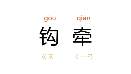引唐 杜宝 《大业杂记》:“并用大铁为细腰,互相鉤牵。”唐 樊宗师 《绛守居园池记》:“蛟龙钩牵。”岑仲勉 集解:“相互绞绕。”明 唐顺之 《盛孺人墓志铭》:“或者鉤牵儿女子,语故噎噎,不能自割。”