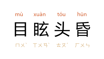 引林语堂 《机器与精神》四:“这种的枪花,不但是外国人所无,就是 中国 的宝贝武人耍出来之后,还要弄得外国记者目眩头昏,眼花撩乱。”亦作“目眩头晕”。 冯雪峰 《雪峰寓言·狐狸和猴子们的铜铃》:“由于这是比转磨还更叫人目眩头晕的,不多工夫狐狸就倒在地上了。”艾芜 《都江堰的神话故事》:“仿佛石坡和楼阁,都会一下子冲倒似的,令人有些目眩头晕。”