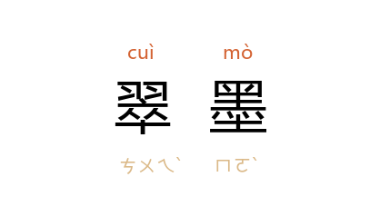 引宋 苏辙 《次韵子瞻题孙莘老墨妙亭》:“爱之欲取恨无力,旋揉翠墨濡黄繒。”清 龚自珍 《己亥杂诗》之五一:“翠墨未乾仙字蚀,云烟半搨掖门旁。”郁达夫 《钓台的春昼》:“向四面的破壁上一看,翠墨淋漓,题在那里的,竟多是些俗而不雅的过路高官的手笔。”