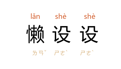 引元 马致远 《耍孩儿·借马》套曲:“懒设设牵下槽,意迟迟背后随,气忿忿懒把鞍来鞴。”《全元散曲·醉中天·咏鞋》:“一带山如画,懒设设鞭催瘦马。”元 无名氏 《举案齐眉》第一折:“恰离了兰堂深处,倩东风扶策我这困身躯,懒设设梳云掠月,意迟迟傅粉施朱。”