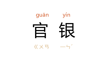 引《红楼梦》第四八回:“谁知那 雨村 没天理的听见了,便设了法子,讹他拖欠官银,拿他到了衙门里去,説:‘所欠官银,变卖家产赔补。’把这扇子抄了来,做了官价,送了来。”清 王士禛 《池北偶谈·谈异七·女侠》:“顺治 初,其县役某,解官银数千两,赴 济南,以木夹函之。”