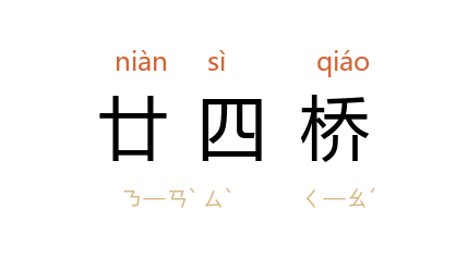 ⒈ 在江苏扬州市境。清李斗《扬州画舫录·冈西录》谓:“廿四桥即吴家砖桥,一名红药桥,在熙春台后。”一说谓二十四座桥。
