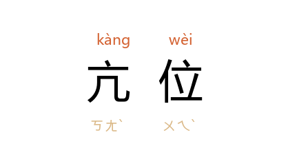 ⒈ 指《易·干》第六爻的爻位。《干》卦“上九”(即第六爻)的爻辞为“亢龙有悔”,故称其爻位为亢位。相传孔子解释何谓“亢龙有悔”时说:“贵而无位,高而无民,贤人在下位而无辅,是以动而有悔也。”后因以“亢位”为前朝失位、后代受禅之兆。