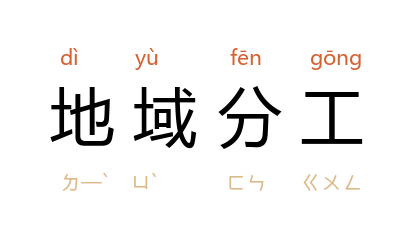 ⒈ 又称“劳动地域分工”。主要指一个国家、一个地区按某一优势的社会物质生产部门实行专业化的生产,它是社会劳动分工在地域上的表现。各地自然条件的差异是地域分工的自然基础,社会经济条件的差异是地域分工的重要原因,地域分工能够实现的原动力是经济效益。