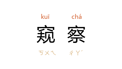 引《隋唐演义》第八三回:“那 李林甫 最能窥察人之隐微,这不是个好惹的。”《红楼梦》第二一回:“﹝ 薛宝釵 ﹞留神窥察其言语志量,深可敬爱。”郭沫若 《初出夔门》三:“二十几年前的二十岁前后的青少年哪里窥察得透学与用之间的关系呢?”杨朔 《月黑夜》:“李排长 牵着马和他并肩走过泥泞的街道,灯影里,留心窥察他的脸色。”