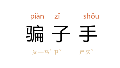 引郭小川 《万里长江横渡》诗:“我们恰恰要在大风大浪中,清扫骗子手们死后的恶臭和生前的阴毒。”袁鹰 《远方之歌·非洲孩子我朋友》:“什么‘真诚的友谊’,呸!地地道道的骗子手。”