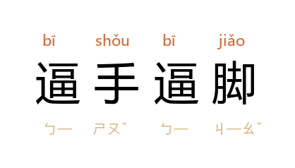 引《儒林外史·第四二回》:「那菜一碗一碗的捧上来,六老爷逼手逼脚的坐在底下吃了一会酒。」