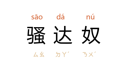 引明 周朝俊 《红梅记·城破》:“赚得些钱儿,指望拿回养家,不想这骚达奴不先不后闯将来,围了禁城,使我上不上下不下。”亦作“骚达子”。 《红楼梦》第四九回:“他一般的也拿着雪褂子,故意装出个小骚达子来。”