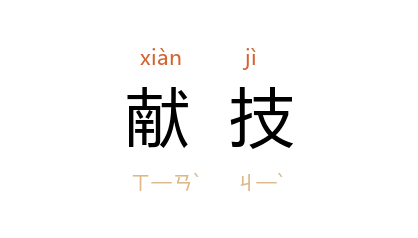 引唐 柳宗元 《钴鉧潭西小丘记》:“由其中以望,则山之高,云之浮,溪之流,鸟兽之遨游,举熙熙然迴巧献技,以效兹丘之下。”宋 陈旸 《乐书·胡部·天竺》:“汉安帝 时, 天竺 献技,能自断手足,刳肠胃。”老舍 《四世同堂》九:“她到 北平 来献技的时候,已经是二十二岁。”