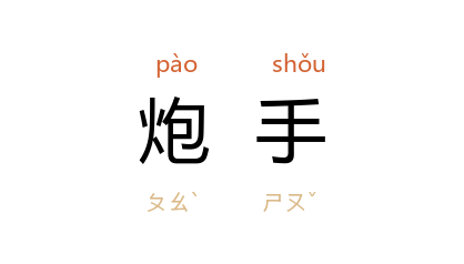 亦作“礮手”。操炮的士兵。 宋 陈规 《守城录》卷一:“或谓砲在城里,砲手不能见得城外事,无由取的。”