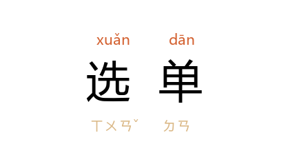 ⒈ 在电子计算机屏幕或图形输入板上,为使用者提供的用来选择项目的表。一般分为命令选单和操作选单。俗称菜单。