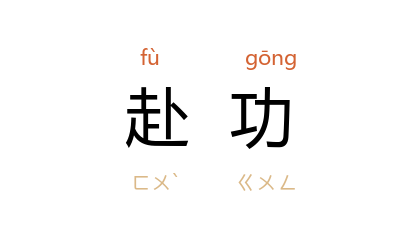 引《宋史·忠义传八·鞠嗣复》:“嗣復 闻难,率吏民修城立门,众赴功,守备略就。”清 陆费瑔 《捉船行》:“侵晨叩官分官钱,十人赴功五人粥。”