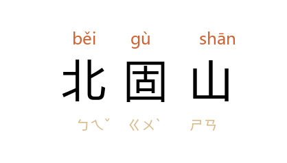 ⒈ 山名。在江苏省镇江市北方,三面临水,山下临长江,形势险固,故称为「北固山」。与金山、焦山合称为「京口三山」。