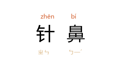 引北周 庾信 《七夕赋》:“缕条紧而贯矩,针鼻细而穿空。”倪璠 注:“《西京杂记》曰:‘ 汉 采女常於七月七日穿七孔针於 开襟楼,俱已习之。’《荆楚岁时记》曰:‘七夕,妇人结綵缕,穿七孔针,陈瓜果於庭以乞巧。’”《敦煌变文集·目莲变文》:“喉咽别纽如针鼻,饮嚥滴水而不容。”阿英 《明朝的笑语》十六:“他走到门前,向妇人家说:‘我能补破针鼻子,但要些饭吃。’”