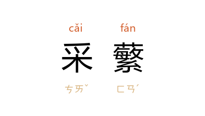 ⒈ 《诗经·召南》的篇名。共三章。根据诗序:「采蘩,夫人不失职也。」或以为咏诸侯夫人祭祀之诗。首章二句为:「于以采蘩,于沼于沚。」蘩,白蒿。
