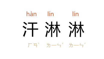 引夏丏尊 叶圣陶 《文心》一:“两人汗淋淋地携了书包走出校门,已是将晚的时候了。”曹禺 《北京人》第一幕:“她头发短短的,汗淋淋的脸红喷喷的。”葛振林 《狼牙山跳崖记》:“这时指导员跑得汗淋淋地闯进来。”