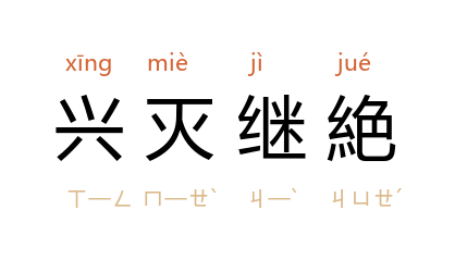 引《论语·尧曰》:「兴灭国,继绝世。」《汉书·卷一八·外戚恩泽侯表》:「自古受命及中兴之君,必兴灭继绝,修废举逸,然后天下归仁,四方之政行焉。」《东周列国志·第二三回》:「兴灭继绝存三国,大义堂堂五霸魁。」