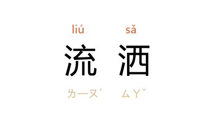 引汉 枚乘 《七发》:“瀄汩潺湲,披扬流洒。”晋 干宝 《搜神记》卷十八:“叔高 大怒曰:‘树老汁赤,如何得怪!’因自严行復斫之,血大流洒。”《诗刊》1978年第5期:“那承上启下的夯声嘹亮,谁会去吝啬自己将要流洒出的汗水和心血。”