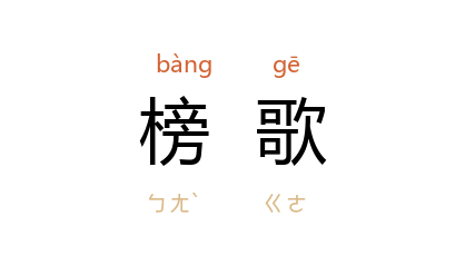 引南朝 梁 虞骞 《寻沉剡□夕至嵊亭》诗:“榜歌唱将夕,商子处方昏。”唐 刘长卿 《七里滩重送》诗:“秋江渺渺水空波, 越 客孤舟欲榜歌。”《随园诗话补遗》卷五引 清 张翽 《夜泊》诗:“榜歌声起欲黄昏,初月微茫漏白痕。”