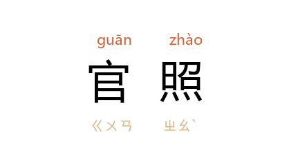 引《二十年目睹之怪现状》第五十回:“再看那大纸包的是一张监照、一张候选通判的官照,上面还填上个五品衔。”《二十年目睹之怪现状》第六四回回目:“无意功名官照何妨是假,纵非因果恶人到底成空。”